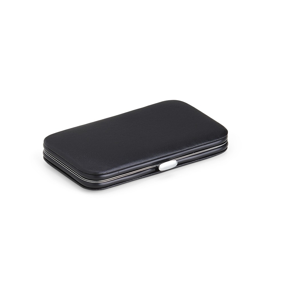Descrição: Kit manicure 7 peças em estojo de couro sintético. Possui: dois cortadores de unhas, tesoura, lixa, pinça, empurrador de cutícula e palito de unha. Parte interna de TNT com suporte de couro sintético para fixar as peças. Para abrir o estojo basta apertar o botão central.