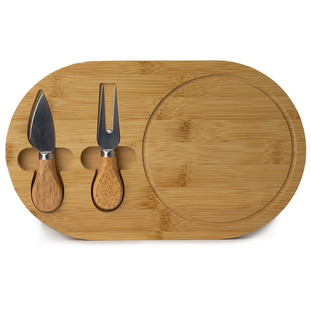 Descrição: Kit queijo 3 peças, contém: tábua de bambu canaleta, faca com ponta, garfo e espátula. Tábua com imã para encaixe e fixação dos utensílios.