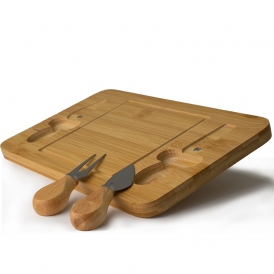 Descrição: Kit queijo 3 peças, contém: tábua de bambu canaleta, faca com ponta, garfo e espátula. Tábua com imã para encaixe e fixação dos utensílios.