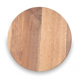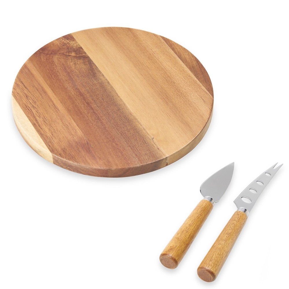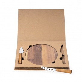 Descrição: Kit queijo 3 peças em estojo kraft, contém: tábua de madeira redonda, faca com ponta, e faca vazada com ponta. Tábua com orifício para encaixe.