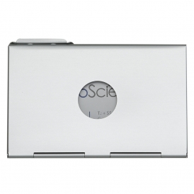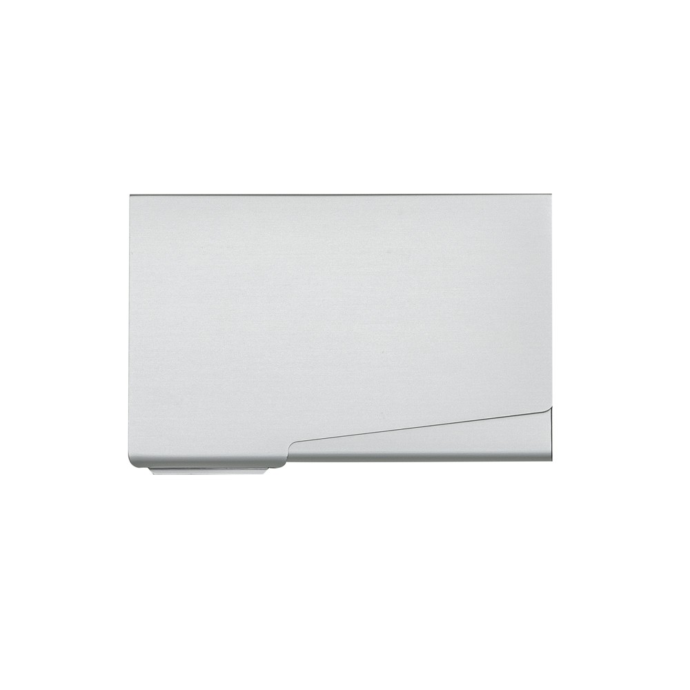 Descrição: Porta cartão de alumínio, design da abertura em diagonal e com um furo central vazado na parte traseira.
